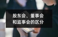 公司中的股东会、董事会和监事会的区分。股东会是公司的最高权力机构,由全体股东组成;董事会是公司的决策机构,负责公司的经营管理和业务活动;监事会则是公司的监督机构,负责监督董事会和经理的行为,以保护公司和股东利益不受损害。