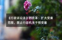 《行政诉讼法》的改革:扩大受案范围,禁止行政机关干预受案《行政诉讼法》的改革,包括扩大受案范围,将更多案件纳入受理范围,保护公民权利。改革要求行政机关不得干预受案,确保公正审判。同时,新法还规定了诉状的受理和处理程序,旨在确保行政案件的受理和处理程序公正,防止行政机关滥用权力,保护公民的合法权益。这些改革