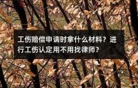 工伤赔偿申请时拿什么材料?进行工伤认定用不用找律师?工伤赔偿申请时需要准备的材料以及工伤认定时的一些注意事项。申请时需提供《认定工伤决定书》、《鉴定结论书》、个人身份证明、劳动能力鉴定费用票据等。工伤认定中需注意故意犯罪、醉酒或吸毒、自残或自杀等情形不得认定为工伤,劳动合同中不得约定发生工伤用人单位概